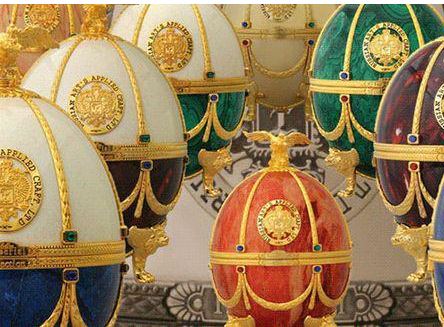 彩蛋內(nèi)裝有一個(gè)醒酒器,四個(gè)威尼斯酒杯和一瓶用自產(chǎn)的小麥、黑麥釀造的超高檔伏特加酒。每只彩蛋的頂端有一只金鷹,它是由在梵蒂岡工作超過(guò)30年的佛羅倫薩珠寶大師設(shè)計(jì)的。